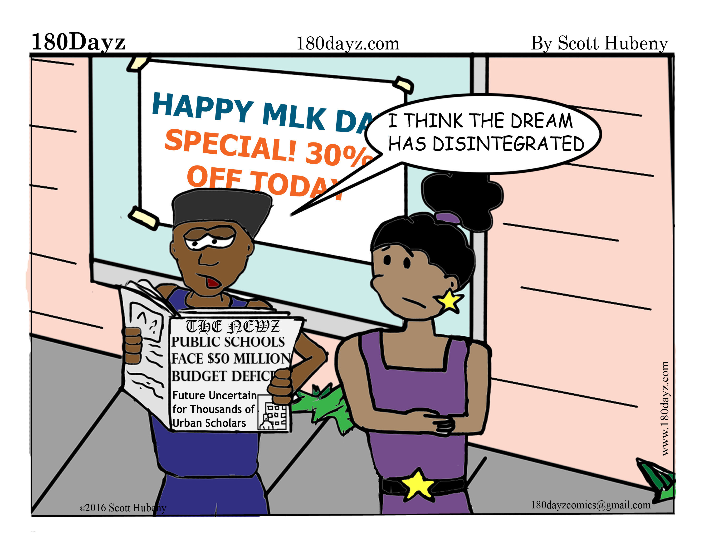 Happy Martin Luther King Day! In honor of the man that combated racism and inequality, I thought I would make a comic that exposes on of injustices that still exists in our society today- the inequality of our educational system. As urban teachers we are asked to bridge the learning gap, yet each year we are continuously cut down as our funds are cut and our schools suffer. Check the following links for more info on what is going down in Boston this year. ( boston globe article , blog post- what happened to Ms B.’s job) I’m sure other urban districts across the nation are or will be facing similar circumstances. Again, if you like, please share, thanks!