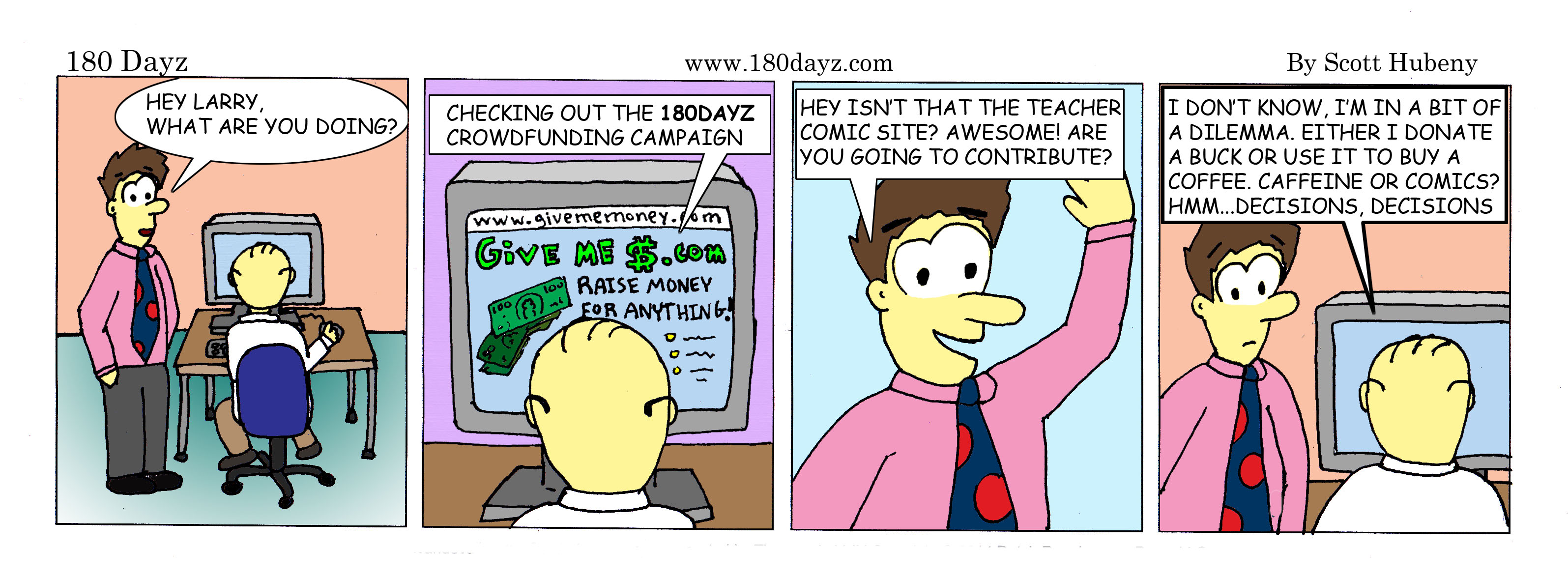 Greetings friends, I have decided to put you all to the test, lol! While 180Dayz is a labor of love for me and I believe that I work I do through the site helps my teacher colleagues by providing them some much needed humor and stress relief, their are some costs associated with running the site (obviously a huge time and labor commitment on my part, but maybe less obvious is the cost for webhosting, etc.). As of now any work you see published has been pro bono and I do not run any pesky advertisements on the site. Basically, any costs to run 180Dayz has been financed by moi. I wanted to put the moxy of 180Dayz to the test and see if the fans find it worthy enough to open up their wallets and donate a couple of bucks to keep it going. Thus, I’m trying to raise $100 on the crowdfunding site Indiegogo to keep 180Dayz up and running (it says campaign amount is $500, but that’s because that’s the minimum amount I must put for some reason, I’m actually just trying to get $100 to cover webhosting and such for this year). It’s a short campaign of just 2 weeks, but if it proves successful it will give me the confidence to push forward into some more substantial 180Dayz offerings and products 🙂 (but more to come on that when this campaign is a success!). So if you can, even if it’s a dollar, show 180Dayz some love and contribute to the campaign, and please share this with all those who would care. The link to the campaign on Indieogo is here: