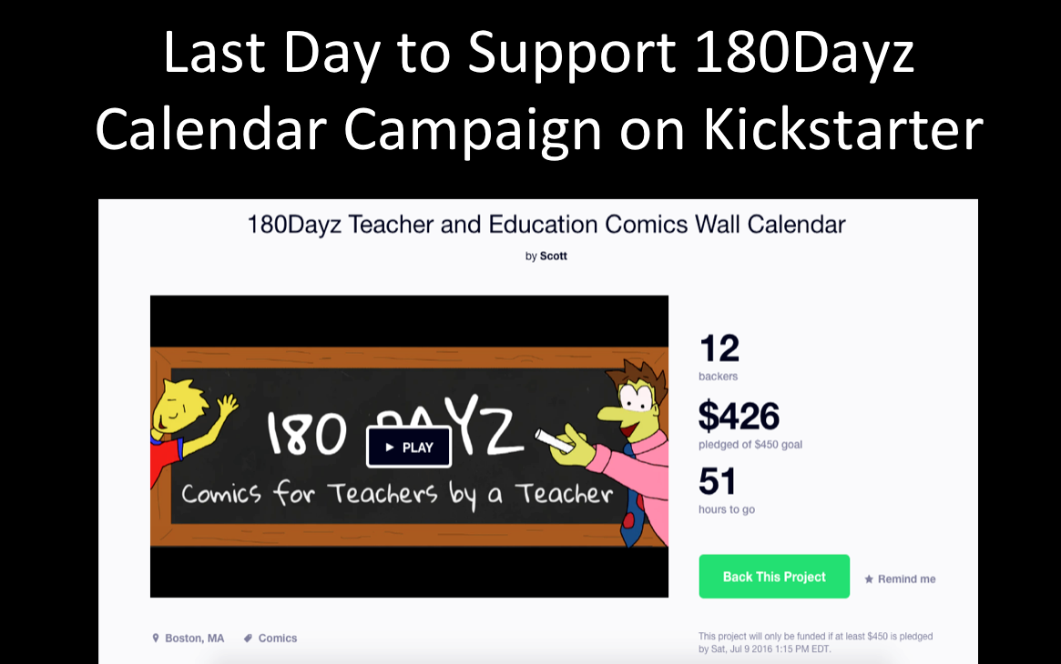 This is it folks! As many of you know we started a campaign on kickstarter some time ago to raise the funds needed to print a school year calendar featuring 12 all new 180dayz comics. Well, the last day of the campaign is upon us. We almost at our goal as we have 94% of the funds raised, but with Kickstarter in order for any of the funds to be released the campaign must make its goal, the 100% mark. (It’s all or nothing funding with Kickstarter projects). So, if anyone has been putting it off until the last minute, this is the last minute my friends. Please go to this link to see the kickstarter campaign: https://www.kickstarter.com/projects/37496334/180dayz-teacher-comics-wall-calendar . I want to thank all who have shown their support already, and want to let you know I have been quite busy working on the comics for this calendar. I am excited to see this project come to fruition and thank everyone for their continued support of 180dayz and hope my comics continue to bring some relief and laughs to your days.