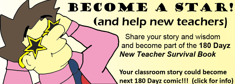 Want to help a new teacher out? Want to see one of your teaching experiences become a 180Dayz comic? Well, there’s a way to do both at the same time! I am venturing forth into a new project this year- creating a book that will help out teachers new to the field by sharing stories and wisdom from our more seasoned educators. Want to help out? I need your first year teaching story. Things your experienced, learned, wish you knew, would have done different, etc. Share your story, and it could be picked to become part of the new 180Dayz book. If picked, your story will be made into a new 180Dayz comic. Help new educators and become a star all at the same time! It’s win-win, so what so you have to lose (except your dignity, lol). Fill out the form below the comic on this page or click on the link to be redirected to the surveymonkey website to fill it out there(Click here to go to link ) Either way, just do it! Thanks, and we’ll be in touch if your story makes the cut.