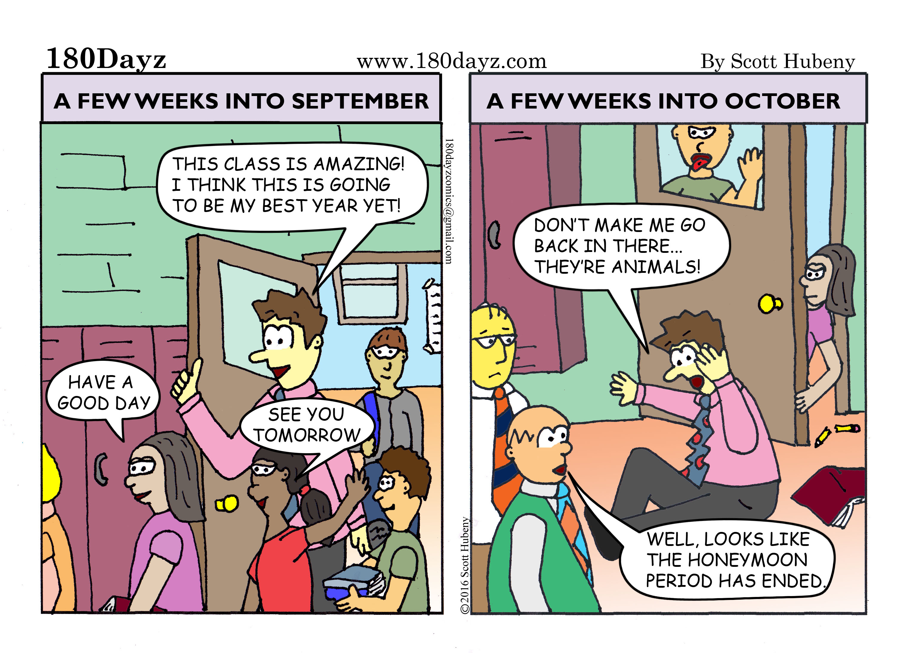 Well, September is all but a distant memory, and so are the little angels that once graced our classrooms as we watch them transform now that the honeymoon period is over. Those of you with the 180Dayz Calendar will recognize this cartoon. What a free calendar? Submit your first year teacher story to 180 Dayz and if I choose to use it for our upcoming book, I will send you a free 180Dayz calendar. Sweet! Here’s the link for details of what I’m looking for. https://180dayz.com/180dayz-new-teacher-book/