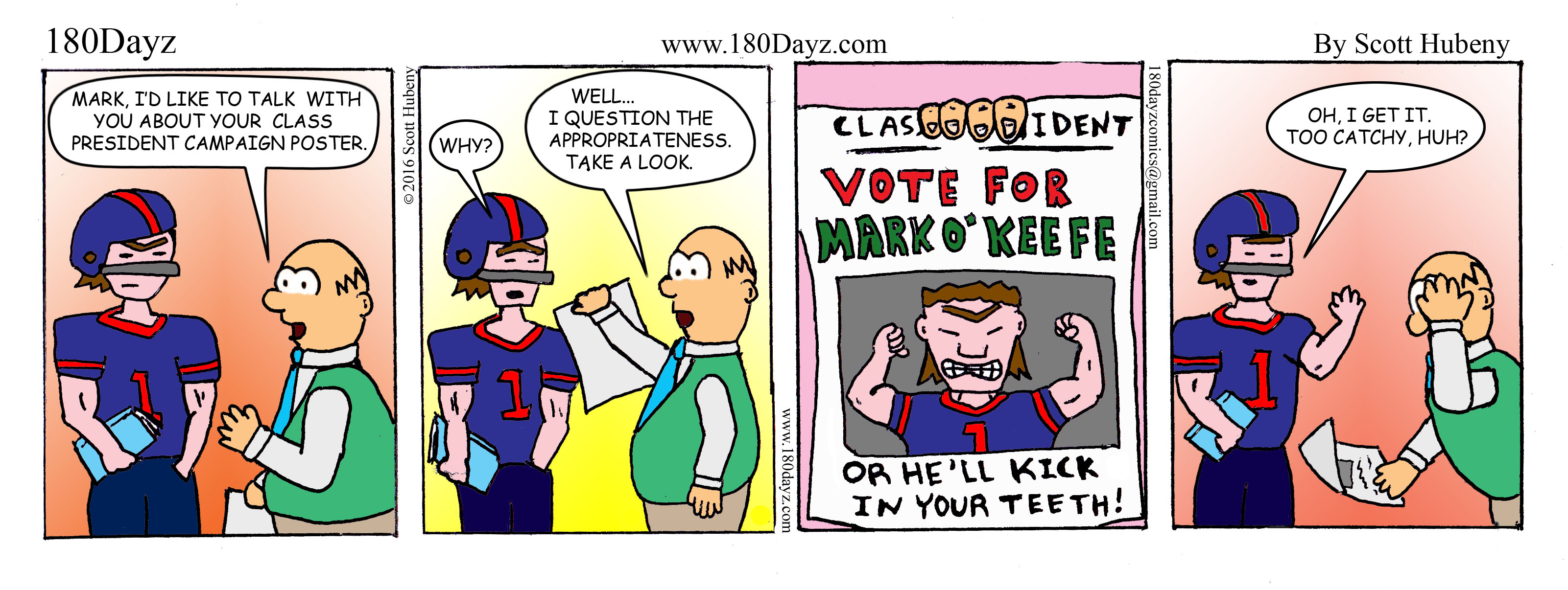 With the election and all I figured I’d repost this comic. This cartoon features a student running for class president that has taken a bit of a crude, unpolished approach to his campaign…hmmm… reminds me of a certain politician…