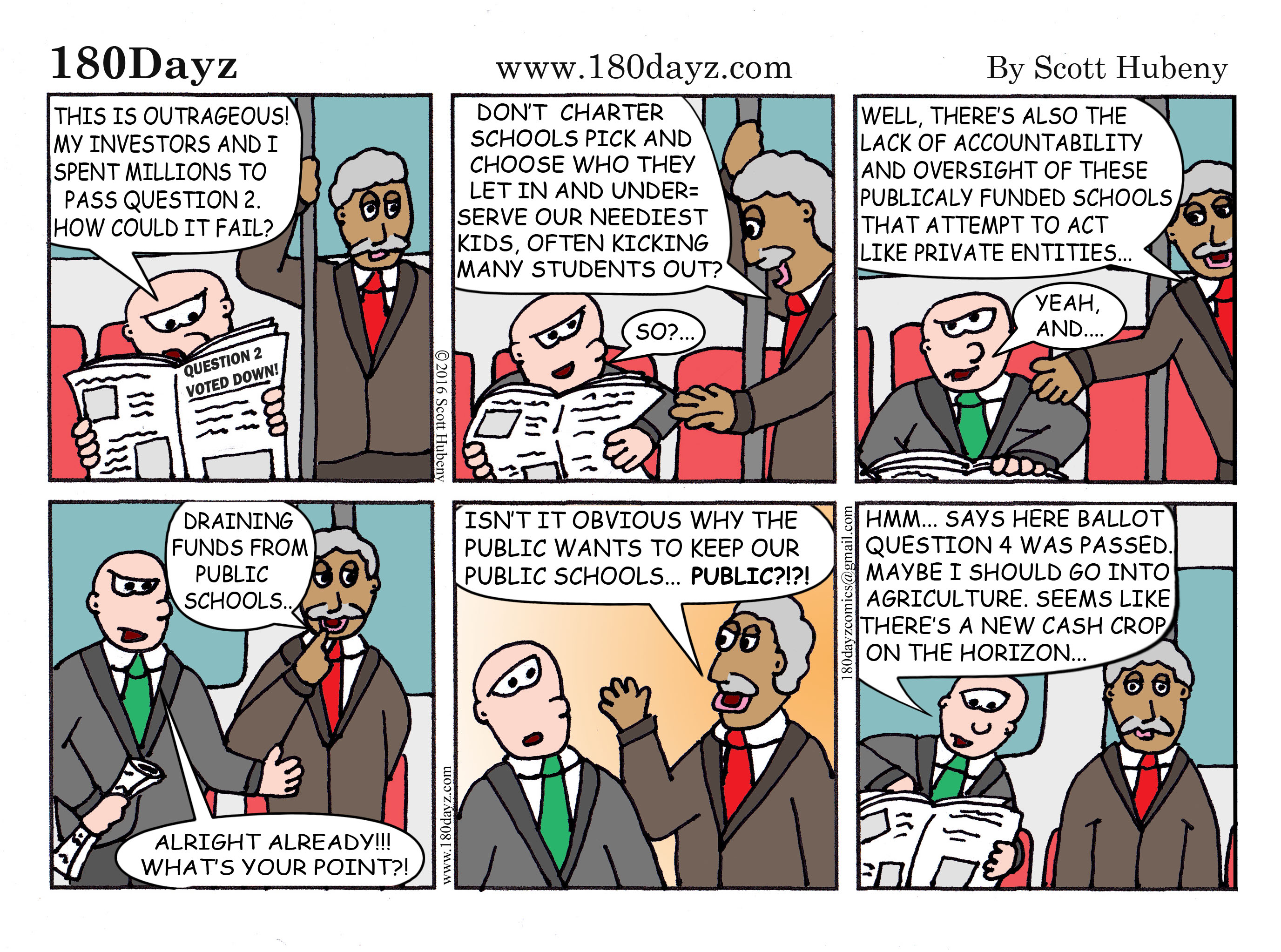 During every election there are a number of ballot measures that the public must vote on. In Massachusetts, the number 2 ballot question was regarding if the cap on the number of charter schools should be lifted. Well, this election the citizens of MA responded with a resounding NO! Check out my comic on this issue to get a little perspective.