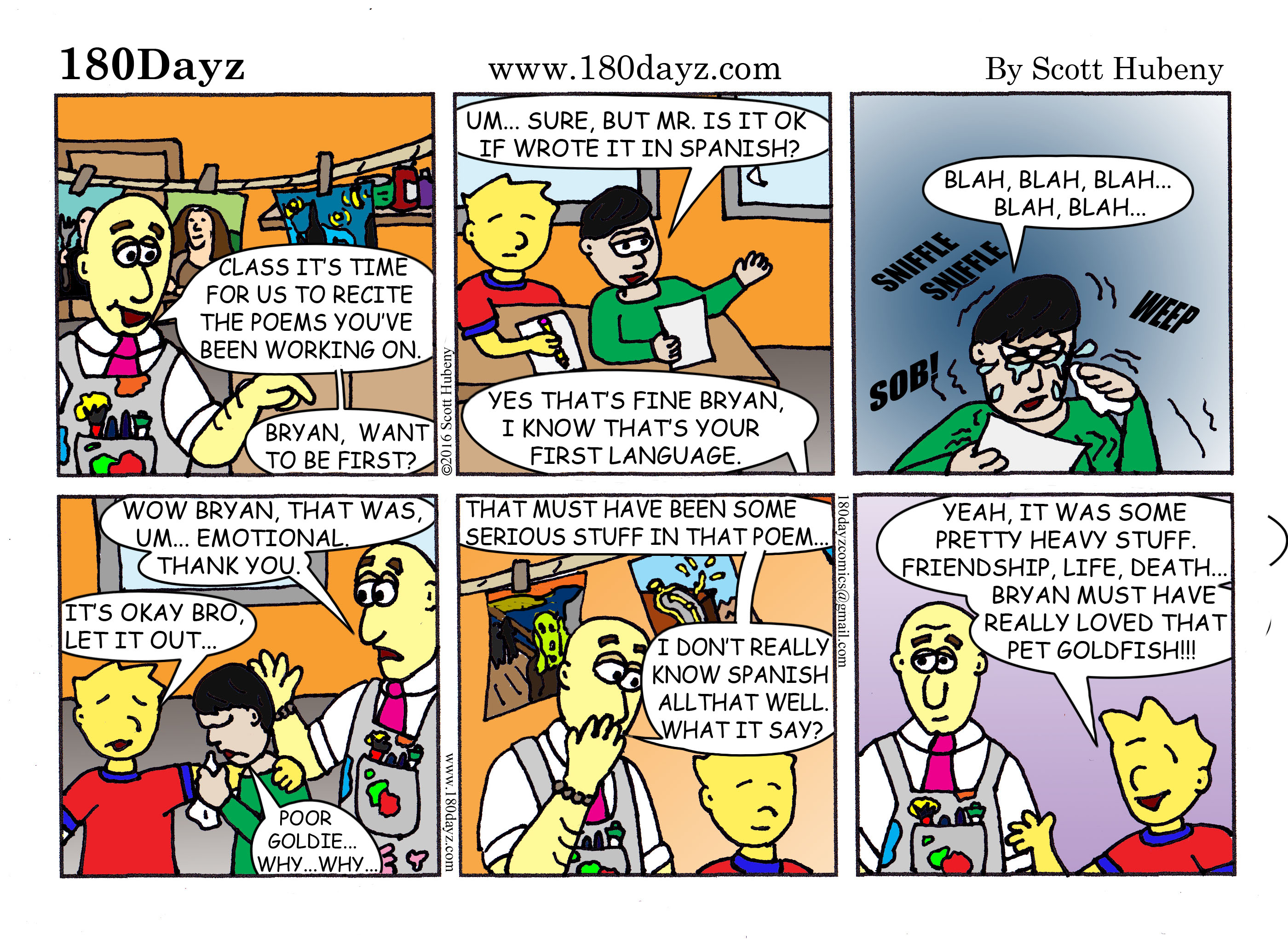 Here’s a comic based on a first year teaching experience submitted by a friend and colleague of mine. Being an art teacher, he’s the super artsy-type and actually wrote his story up in poetic form! Check it out below the comic. If you’d like your story to be a 180Dayz comic and part of our new book, send it my way at 180dayzcomics@gmail.com. Don’t forget to check out the 180 Dayz New Teacher Book Project we just launched at Kickstarter.com. Support it and make it happen! Thanks!