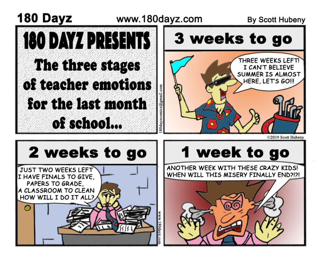 As we approach the end of the school year, I am sure that you are experiencing, much like myself, a myriad of emotions. I feel this cartoon helps illustrate just what teachers go through as we await that final school day bell to toll.